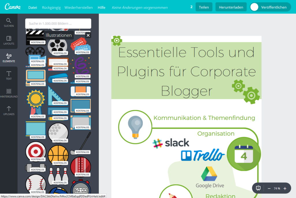 Um unsere Blogbeiträge ansprechend zu gestalten, nutzen wir neben Photoshop vor allem das Online-Tool Canva. Canva hilft uns bei der Erstellung unserer Titelbilder und Infografiken für das Social Media Seeding.