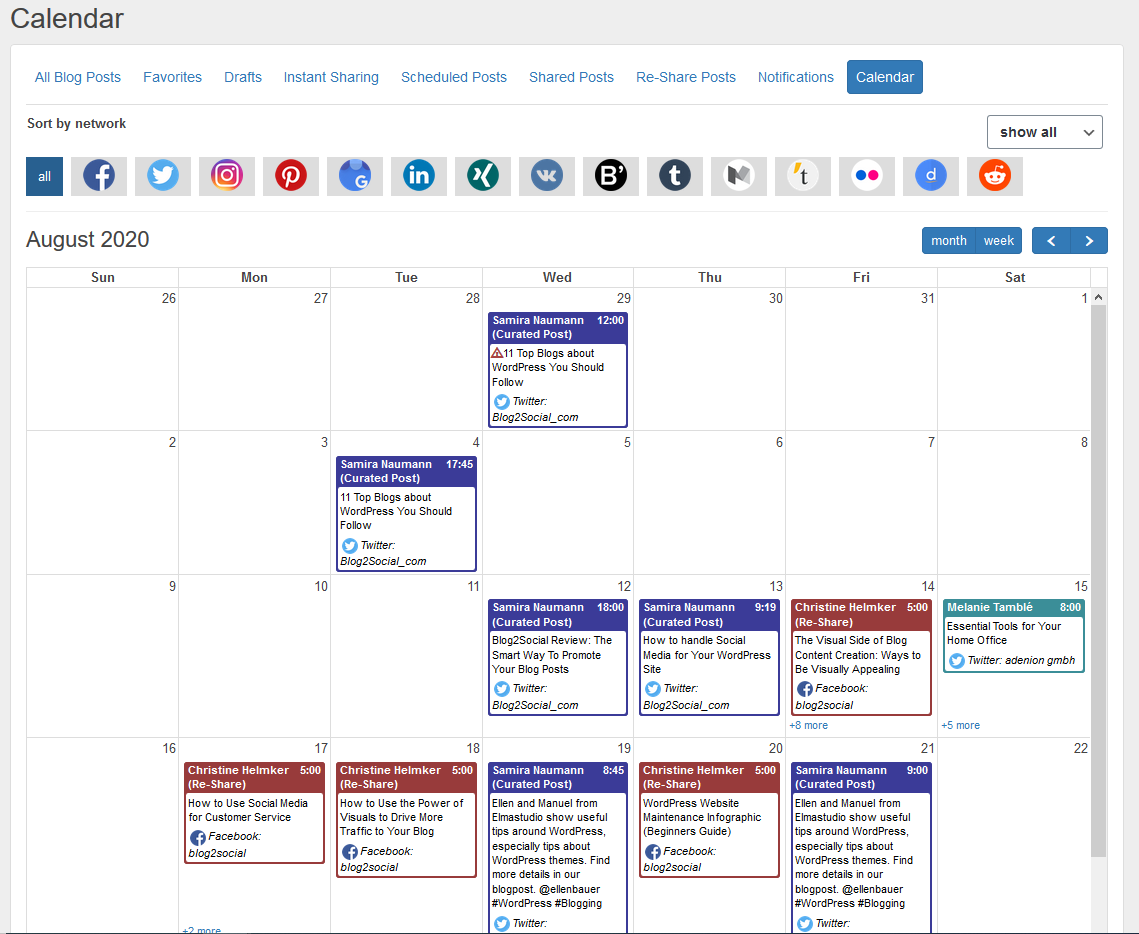 At the top of your calendar under "Sort by network" you can select whether you want to see your scheduled posts for all networks, or just for specific networks. You can do so by clicking the "all" button or by selecting the icon of the network you’d like to see an overview for.